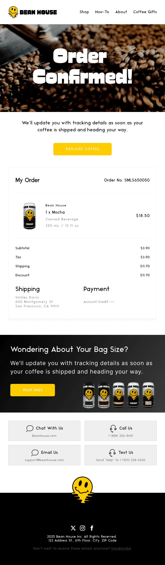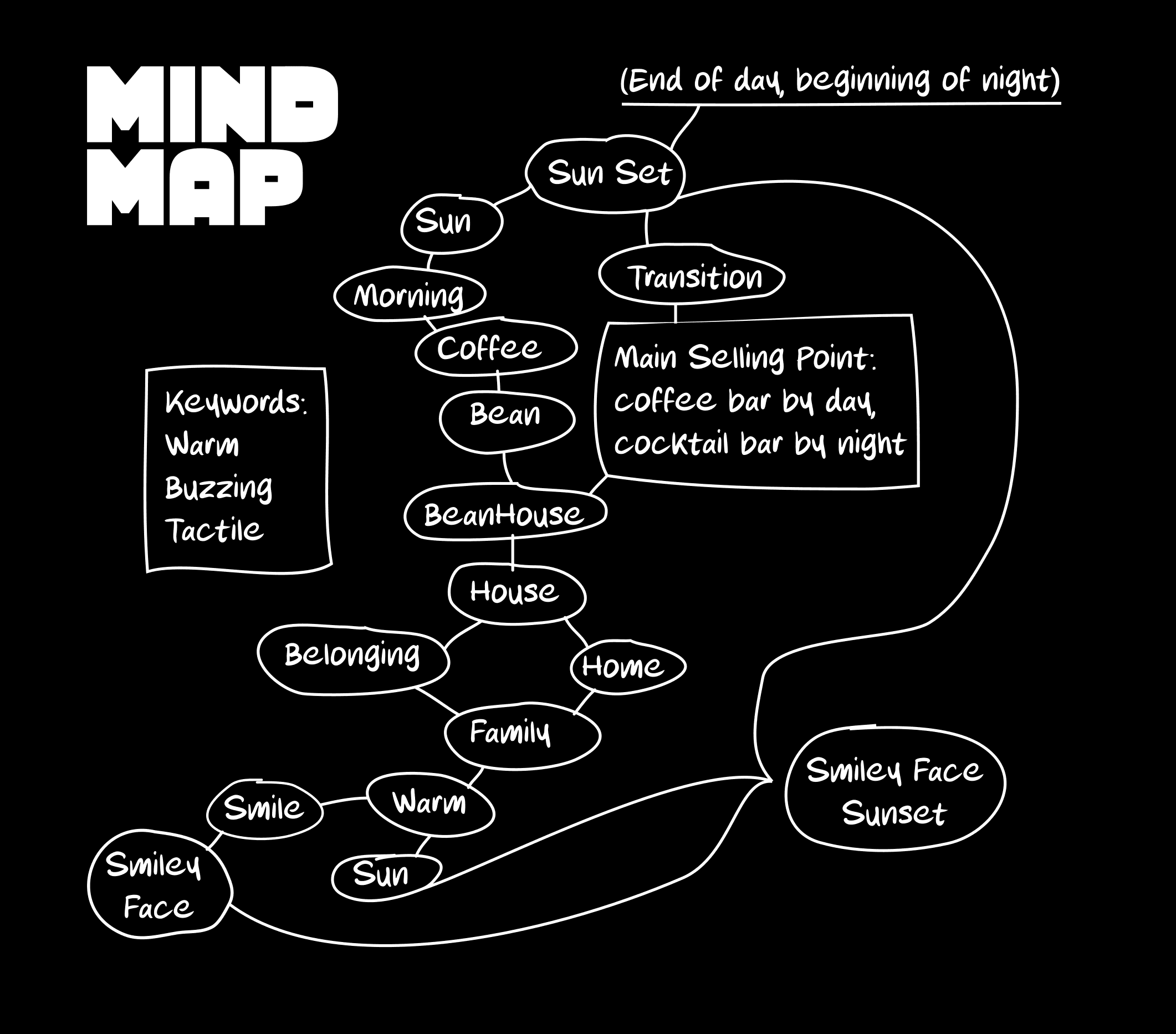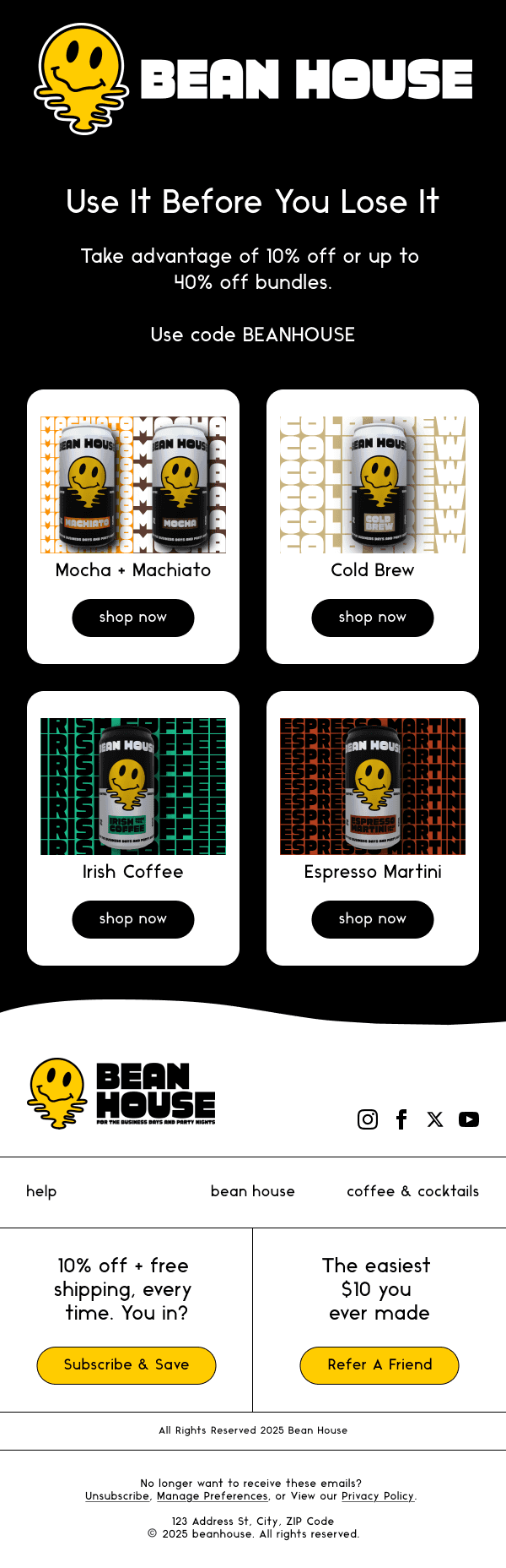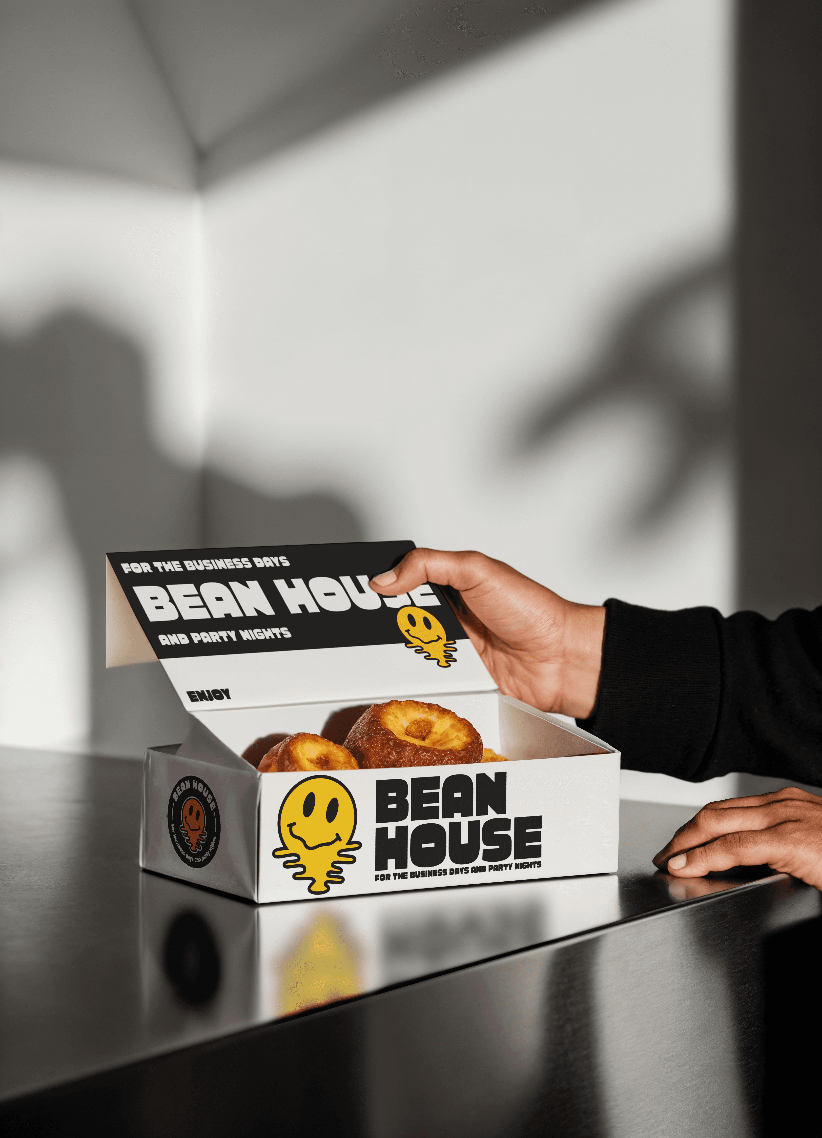 Bean House’s packaging was created with minimalism at its core — clean, bold type paired with the smiling icon. Daytime packaging emphasizes clarity and functionality with sharp black-and-white contrasts, while nighttime packaging introduces subtle bursts of color and playful layouts. This balance maintains consistency while signaling a shift in mood, reinforcing the brand’s dual character.
