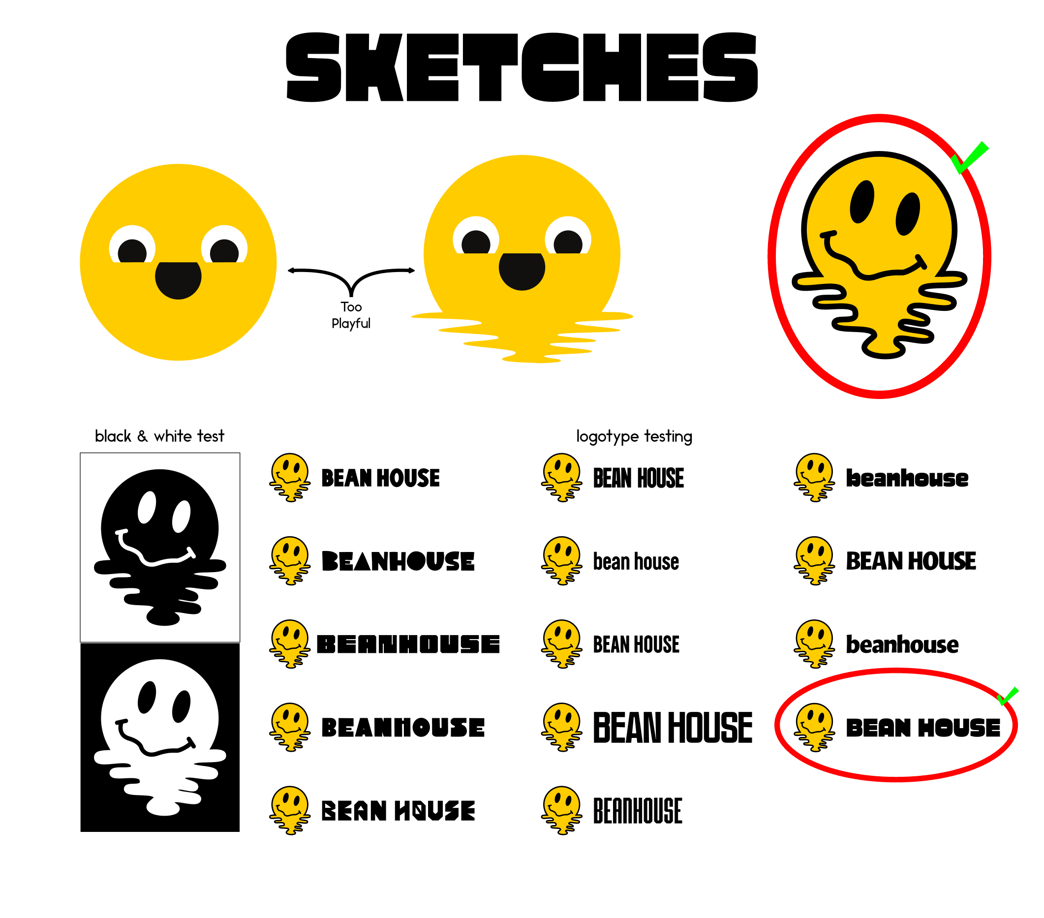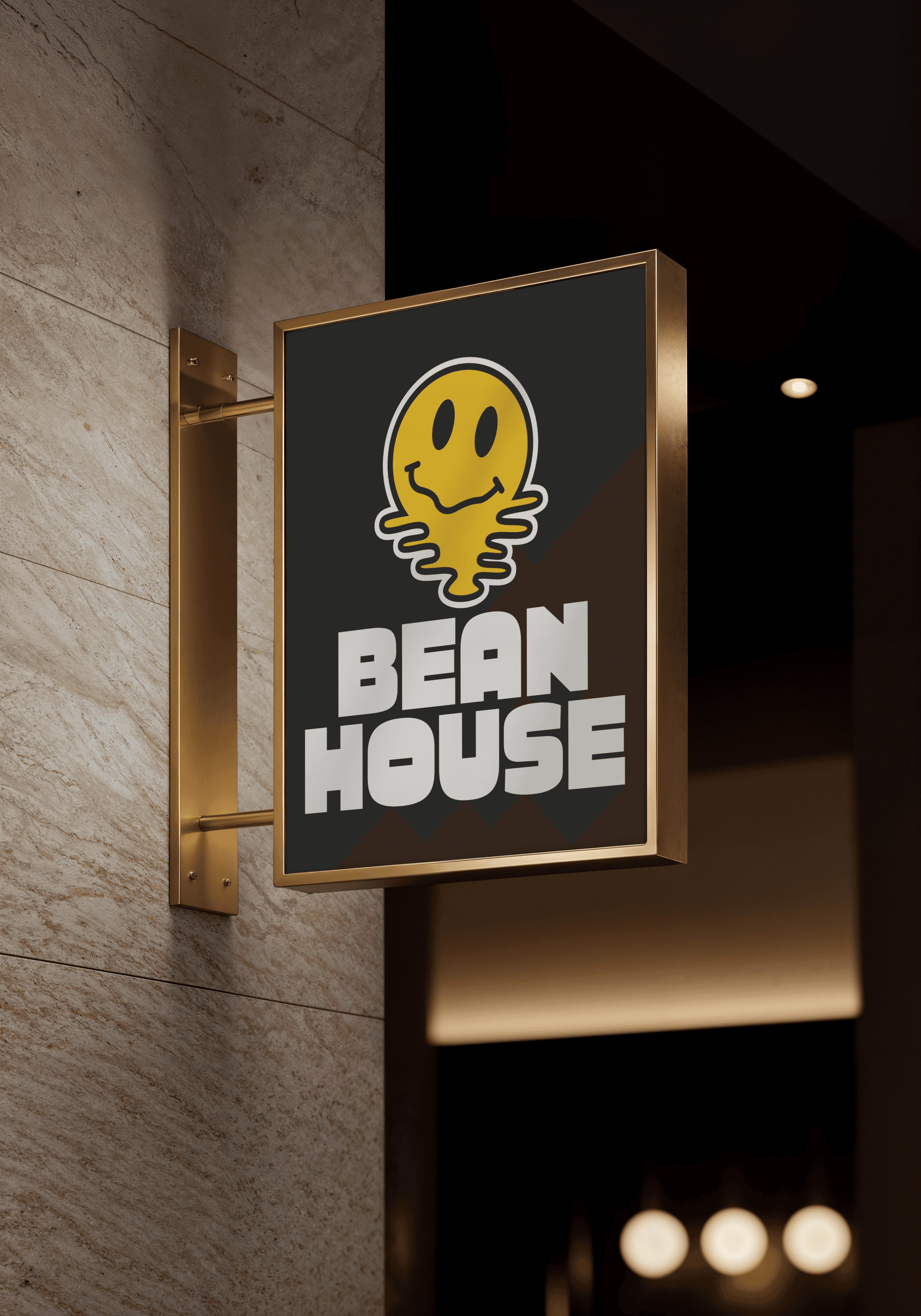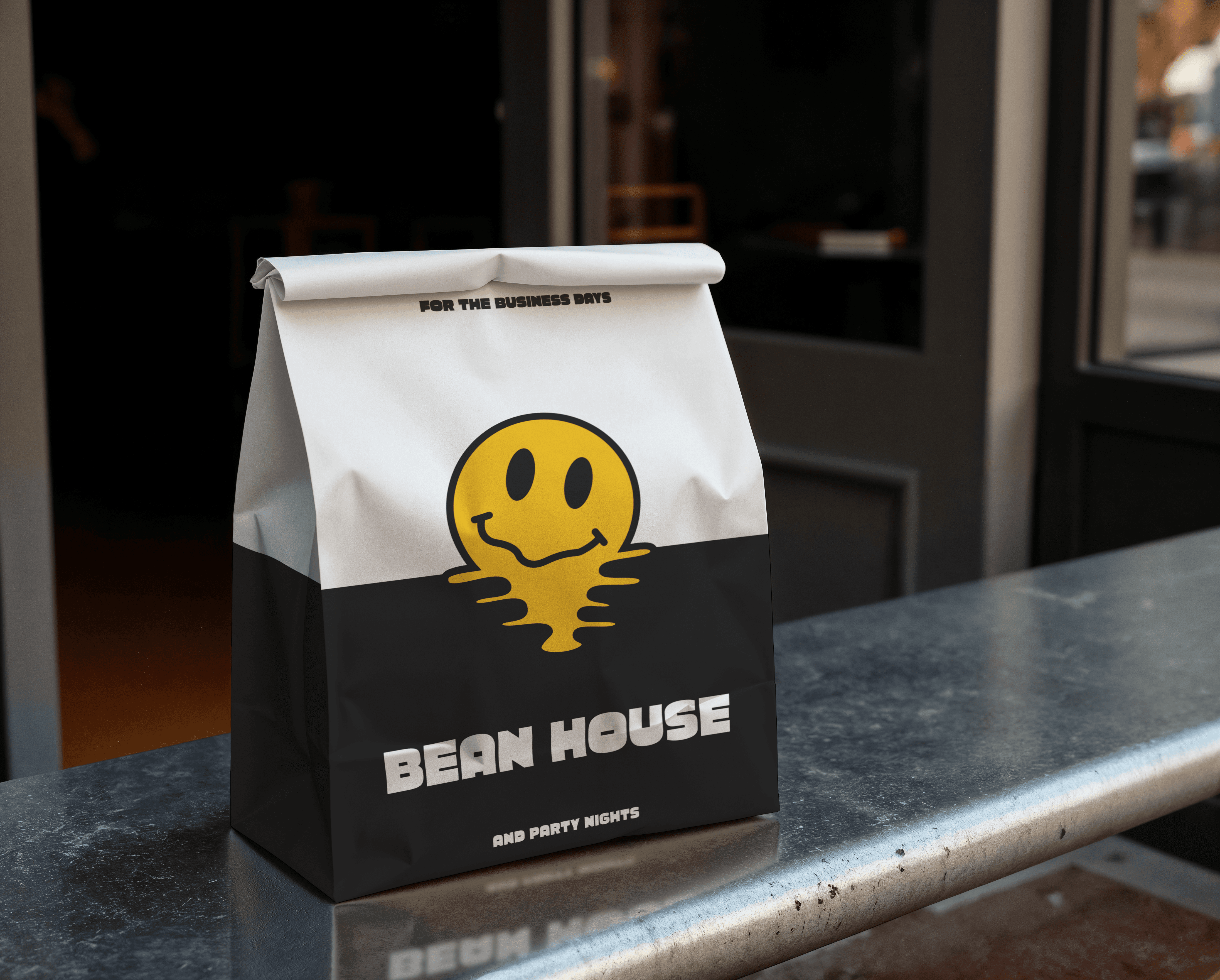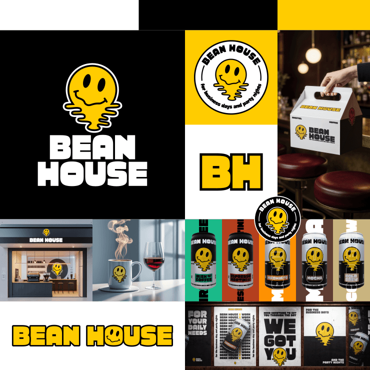 The Bean House logo suite was developed to be flexible, adaptable, and instantly recognizable across contexts. At its core is the melting smiley icon — a symbol of warmth, playfulness, and energy — paired with bold, block typography that reflects the brand’s brutalist roots.