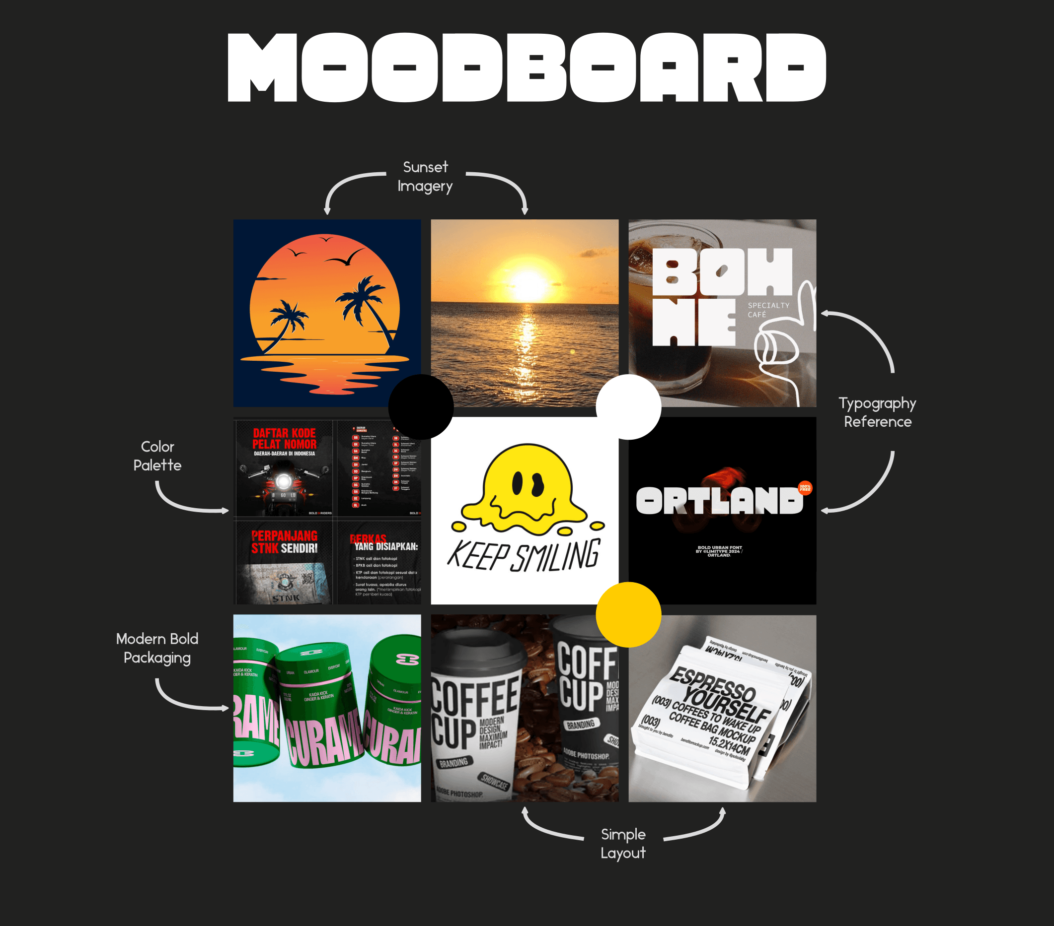 The design process began with a moodboard that highlighted contrasts: brutalist architecture for strength and structure, playful street graphics for energy, and minimalist packaging for clarity.