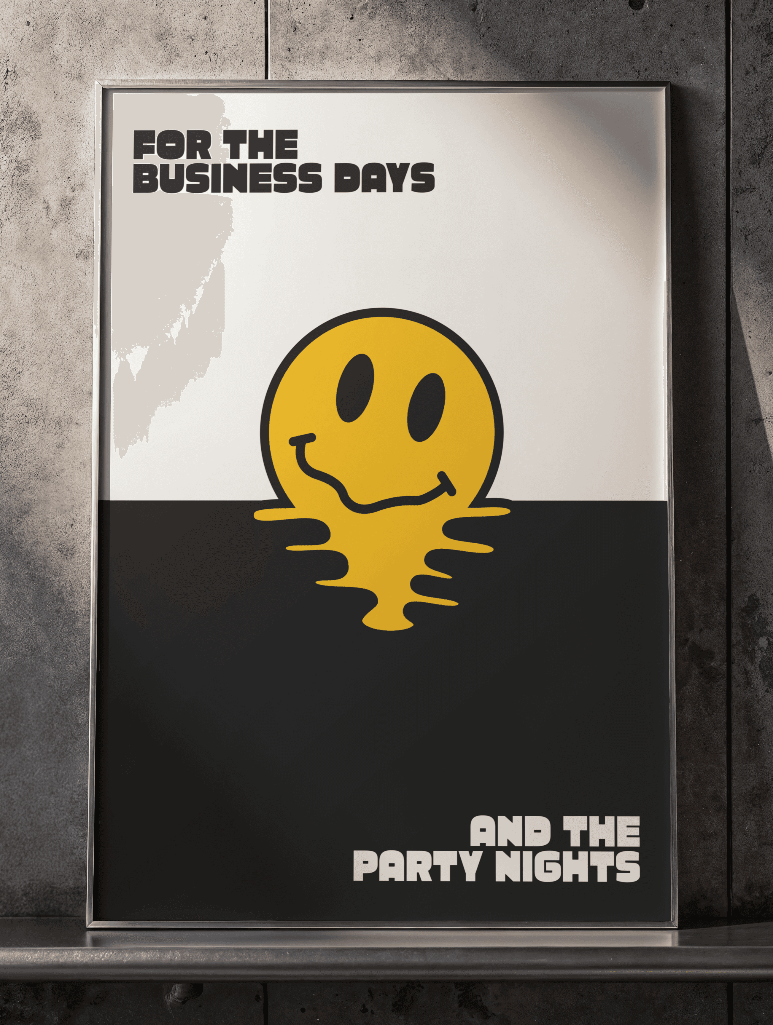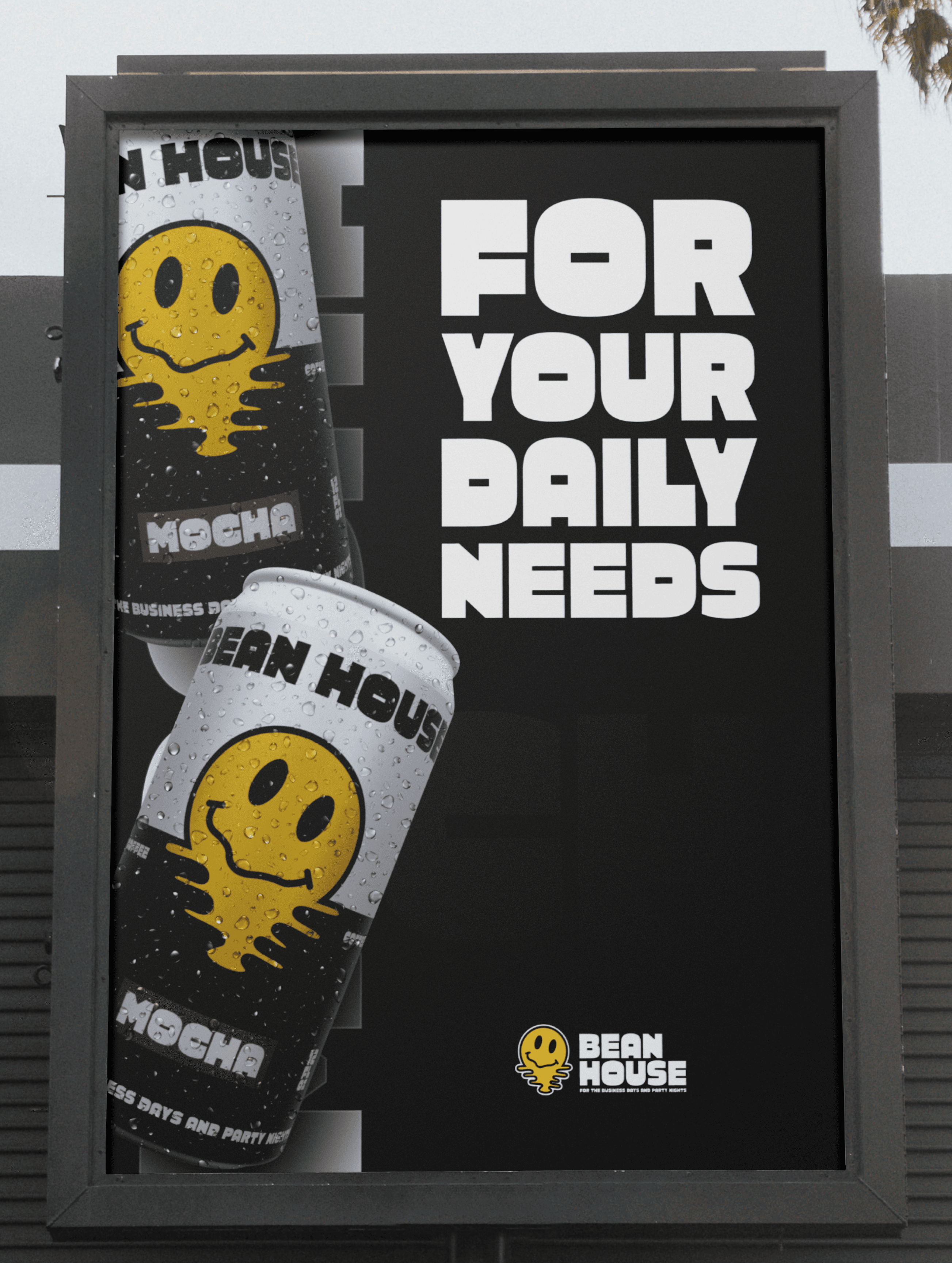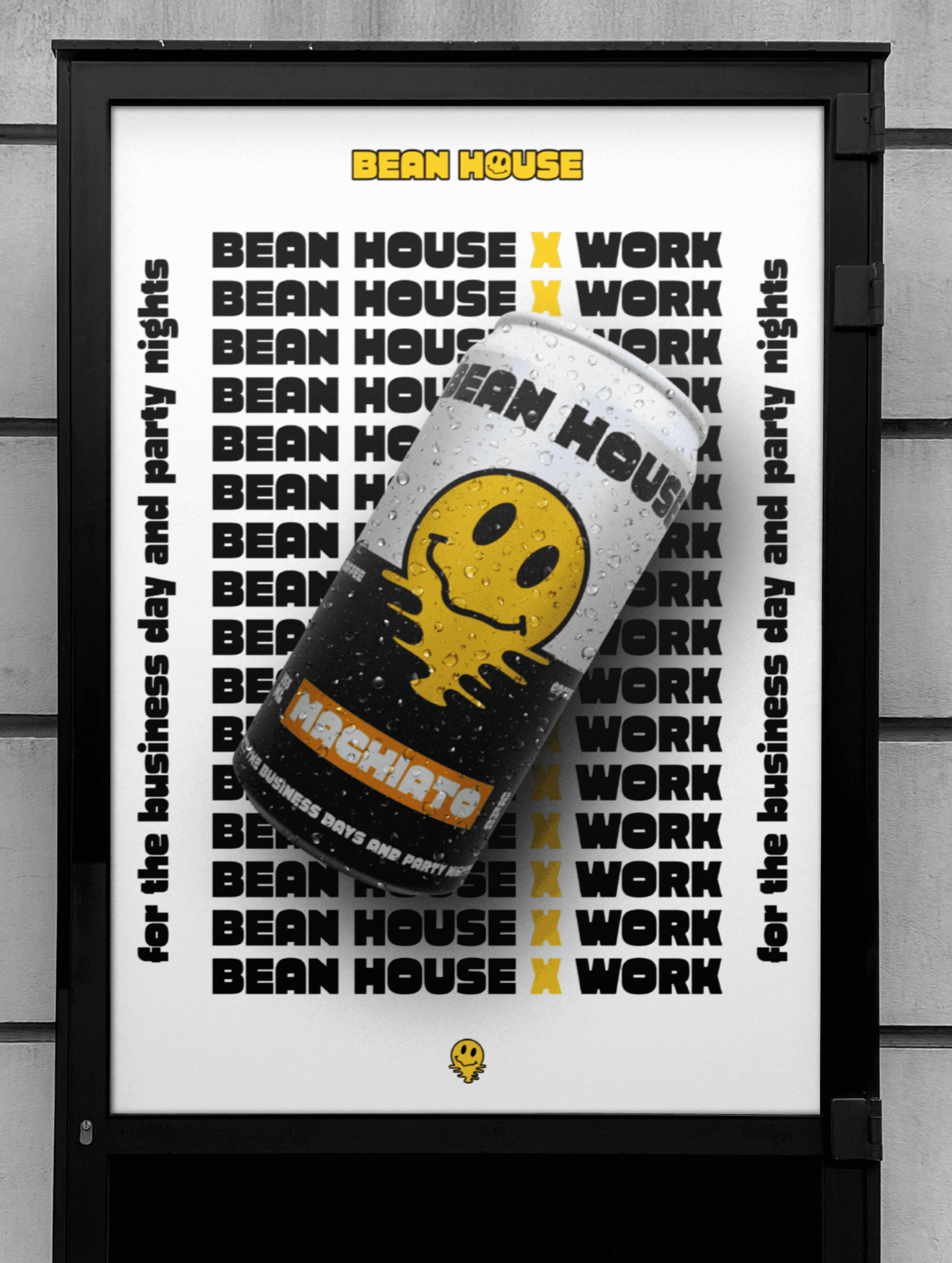 Posters for Bean House adopt the same bold typography and smiling icon but are adjusted depending on their purpose. Day-focused posters lean into structured layouts with clear messaging about coffee and productivity, while night-focused posters loosen the grid, using dynamic type arrangements to emphasize energy and nightlife. Both remain unmistakably Bean House through their visual anchors.