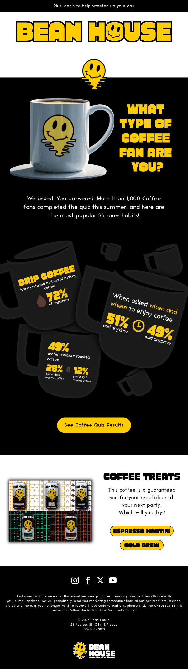 The email system mirrors the dual tone of the brand. Daytime campaigns are stripped back and functional, with clean layouts, bold headers, and an emphasis on coffee promotions or business-related offers. Nighttime campaigns embrace vibrancy, incorporating the smiley icon and pops of yellow to highlight cocktail specials, nightlife events, and late-night promotions. This adaptability keeps communications engaging while maintaining a consistent identity across digital channels.