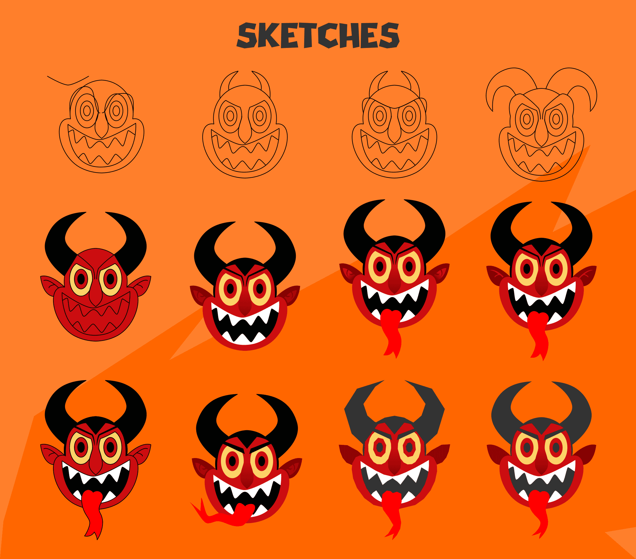 The sketches explored variations of the devil mascot’s face and expressions, helping define his mischievous personality and adaptability across flavors.