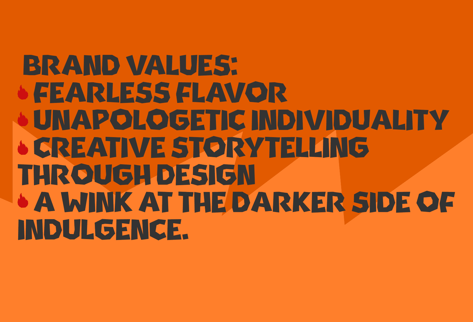 Brand values include fearless flavor, unapologetic individuality, creative storytelling through design, and a wink at the darker side of indulgence.