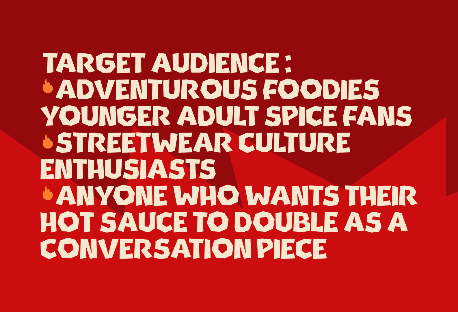 The target audience includes adventurous foodies, younger adult spice fans, streetwear culture enthusiasts, and anyone who wants their hot sauce to double as a conversation piece.